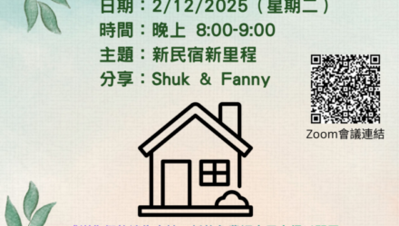 12月2日網上分享祈禱會 時間:晚上8:00 -9:00 主題:新民宿新里程 分享:Shuk &...